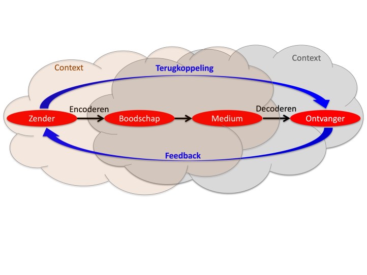 - Feedback: reactie die de zender krijgt van de ontvanger. Uit deze reactie kan de zender concluderen of de boodschap is overgekomen zoals hij had bedoeld.