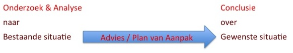 Als je de bestaande situatie hebt beschreven kun je een Conclusie trekken (d.m.v. Confrontatie Intern – Extern) over wat eraan verbeterd kan worden, ofwel hoe de Gewenste situatie eruit moet zien. De “rode woorden” in bovenstaand figuur verwijzen naar teksten in je rapport en/ of bijlagen.