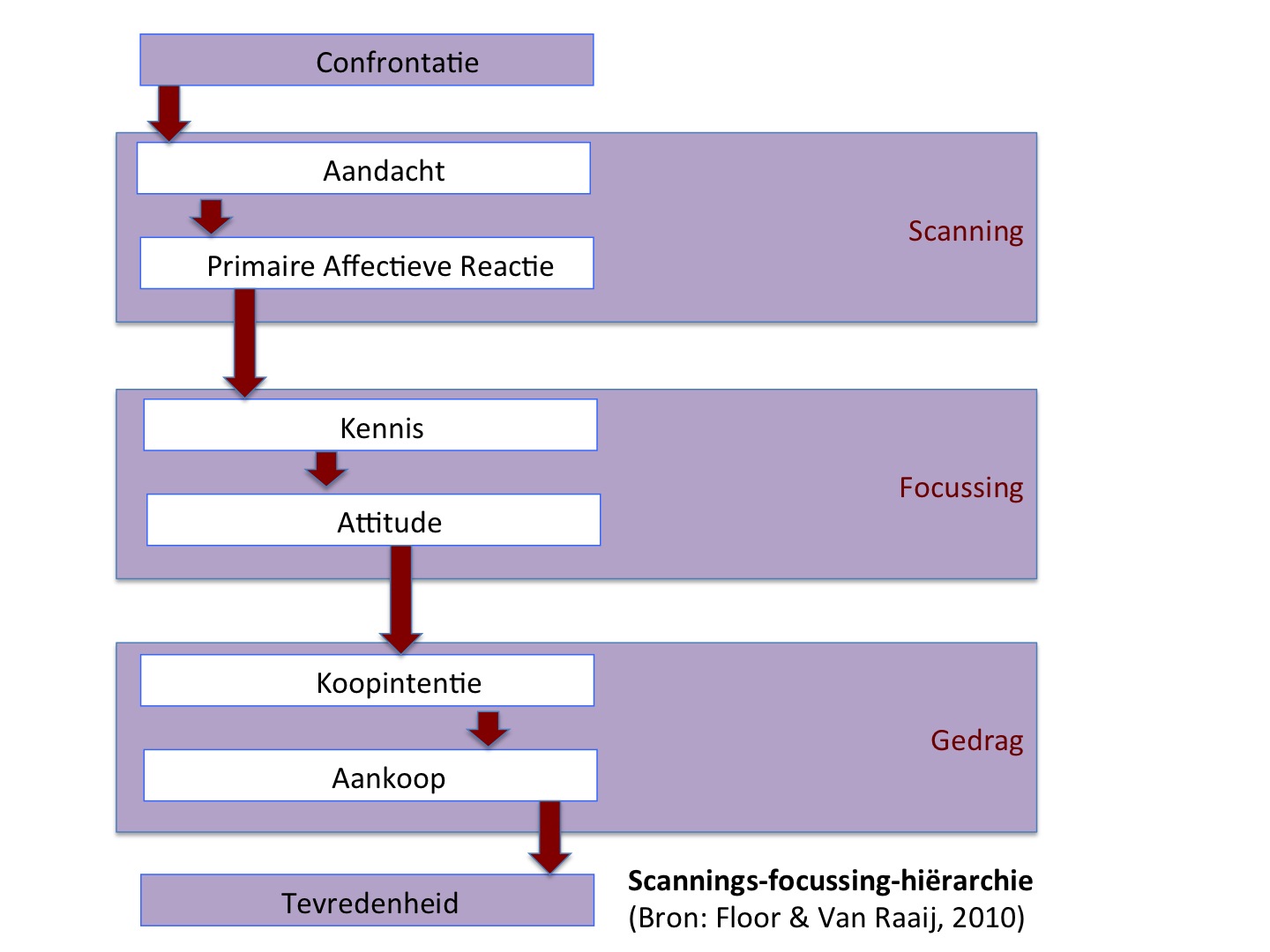 In het model van de Scannings-focussing-hiërarchie combineert Prof. Dr. van Raaij verschillende andere modellen. Het model concentreert zich op de confrontatie met een uiting. Dat is een belangrijk verschil met het model van de Fasen van Marketingcommunicatiewerking , want dat gaat in principe over de confrontatie van de ontvanger met een marketingcommunicatie-campagne, en dat kan enige weken duren. Op het eerste gezicht lijken de modellen erg op elkaar en hebben ook grotendeels dezelfde aanduidingen.