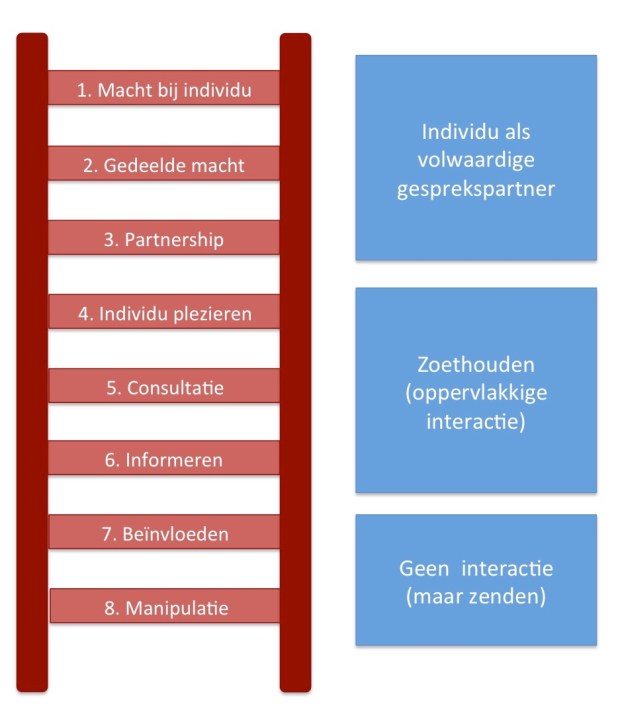Hoe hoger in de piramide, hoe meer en hoe diepgaander de interactie. Interactie kan er namelijk op gericht zijn om de andere partij beter te leren kennen en zo beter te kunnen beïnvloeden. Maar interactie kan er ook op gericht zijn om zèlf te veranderen, waardoor beide deelnemers aan het communicatieproces naar elkaar toe groeien en een meer gemeenschappelijke beleving krijgen. Meer over de Interactieladder.