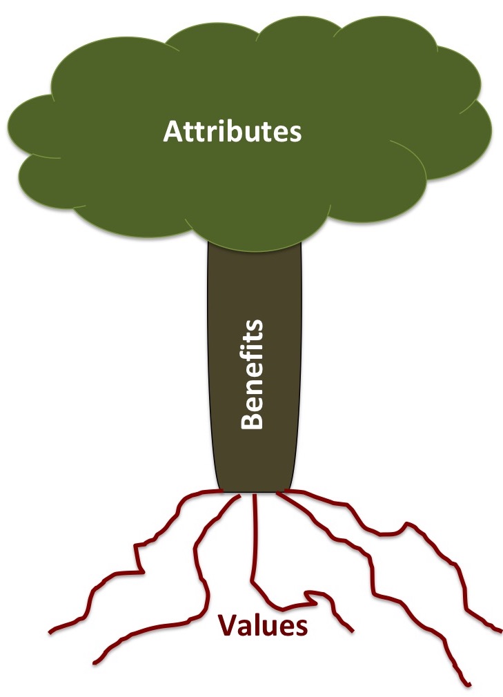Je zou de associaties in je brein nu kunnen vergelijken met een ‘boom in je brein’. Als je deze boom van bovenaf benadert, dan zie je de oppervlakkige associaties: de attributen. Deze attributen zijn als de blaadjes aan de boom. Daal je af in de boom, dan kom je bij de stam: de benefits. In deze benefits vertaalt je brein wat al die attributen betekenen voor jou: welke voordelen hebben ze voor jou? Die voordelen worden gevoed door de wortels in je brein: je waarden.
