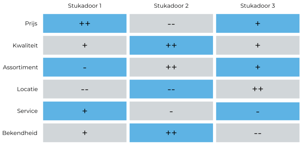 - Welke kenmerken van deze concurrenten vindt de doelgroep het belangrijkst: op welke kenmerken baseert hij zijn keuze om voor een van de concurrenten te kiezen?