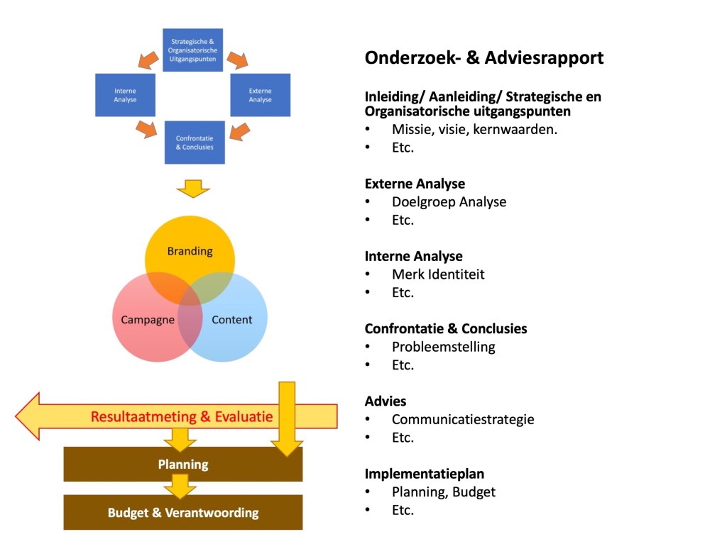 met overeenkomstige onderdelen in Onderzoek- & Adviesrapport. Daaronder vind je wat je bij elk van de onderdelen kunt doen, je kunt hierop variëren voor specifieke situaties, door onderdelen weg te laten of toe te voegen. Aan het eind van dit artikel vind je enige voorbeelden van variaties op het Basisoverzicht Communicatieplanning.