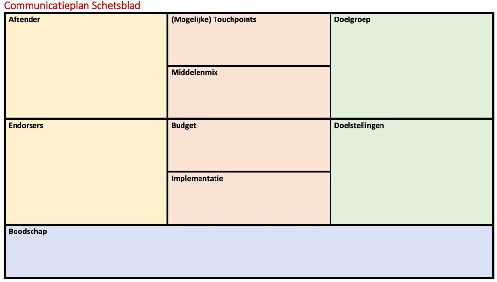 Maak de Onderdelen van het Communicatieplan één voor één, of begin ergens op het schetsblad. Een combinatie kan natuurlijk ook. Kies de manier die bij jou past en bij het probleem dat jij wilt oplossen.