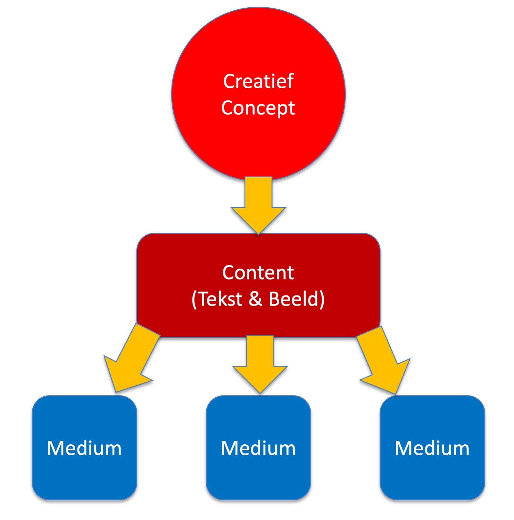 Creatief Concept wordt vertaald in Content (tekst, beeld, film, muziek etc.), deze Content komt terug in alle Media in een Campagne.