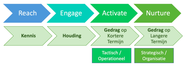 In bovenstaand plaatje zie je het REAN-model, gekoppeld aan het Dominomodel van Communicatie-effecten, ook zie je waar enerzijds het Strategisch en Organisatie Niveau en anderzijds het Tactisch en Operationeel Niveau passen. (Het REAN-model kun je gebruiken voor het verdelen van de Customer Journey in vier fases.)