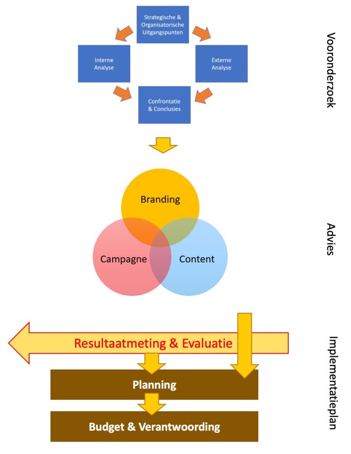 FocusMiddelen (advertentie, flyer, webpage etc.), eventueel gecombineerd in Campagne.Campagne, gebaseerd op Analyse en Evaluatie.Relatie met stakeholders.