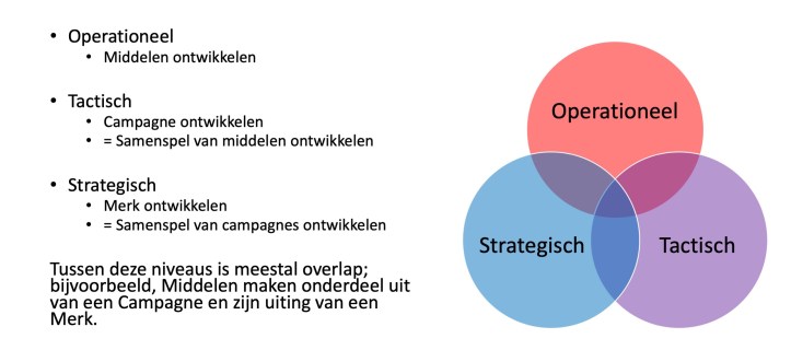 De drie niveaus moeten met elkaar in harmonie zijn en als je werkt op het ene niveau, dan moet je altijd rekening houden met de andere twee niveaus. Hierbij helpt bijvoorbeeld: Communicatie, Contentmarketing en Branding op Strategisch, Tactisch en Operationeel Niveau.