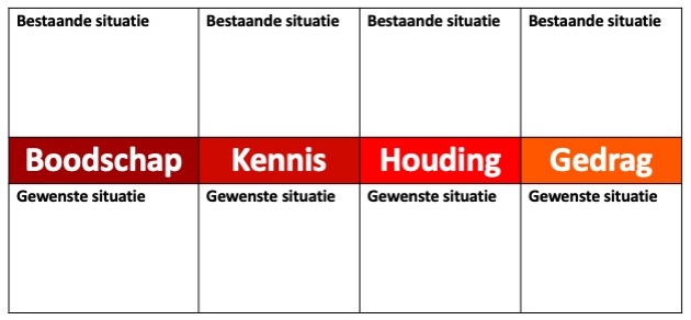 - Welke communicatie-effecten / doelstellingen zou je bij elk van de doelgroepen moeten bereiken?